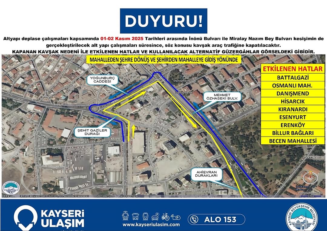 Kayseri'de, İnönü Bulvarı ile Miralay Nazım Bey Bulvarı'nın kesişiminde yer alan kavşakta yapılacak altyapı yenileme çalışmaları nedeniyle trafik düzeninde değişikliğe gidilecek. Sürücüler, 1