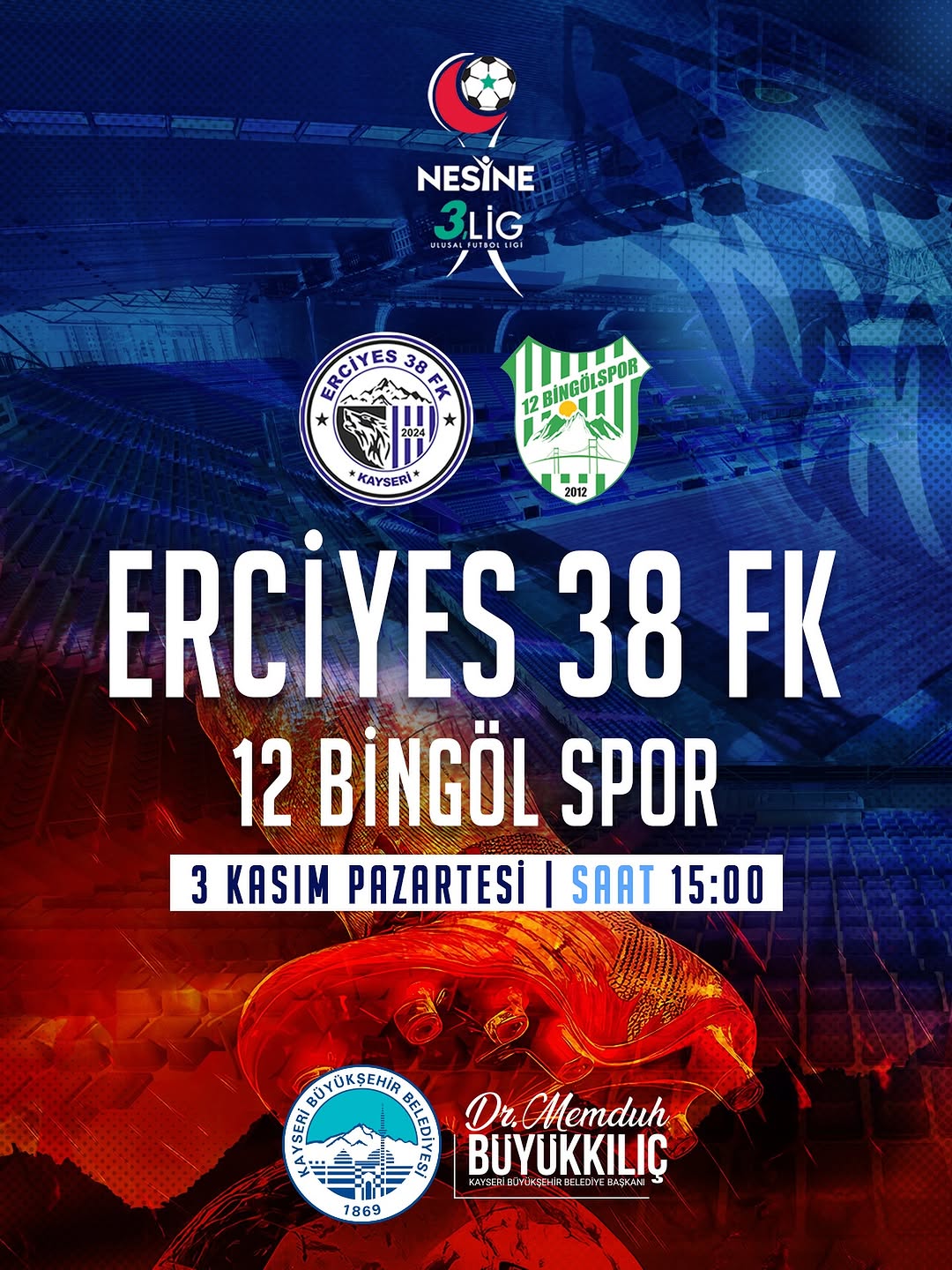 Kayseri'nin gururu Erciyes 38 FK, bugün kendi sahasında Bingöl Spor ile önemli bir karşılaşmaya çıkıyor. Maç, saat 15:00'te başlayacak.