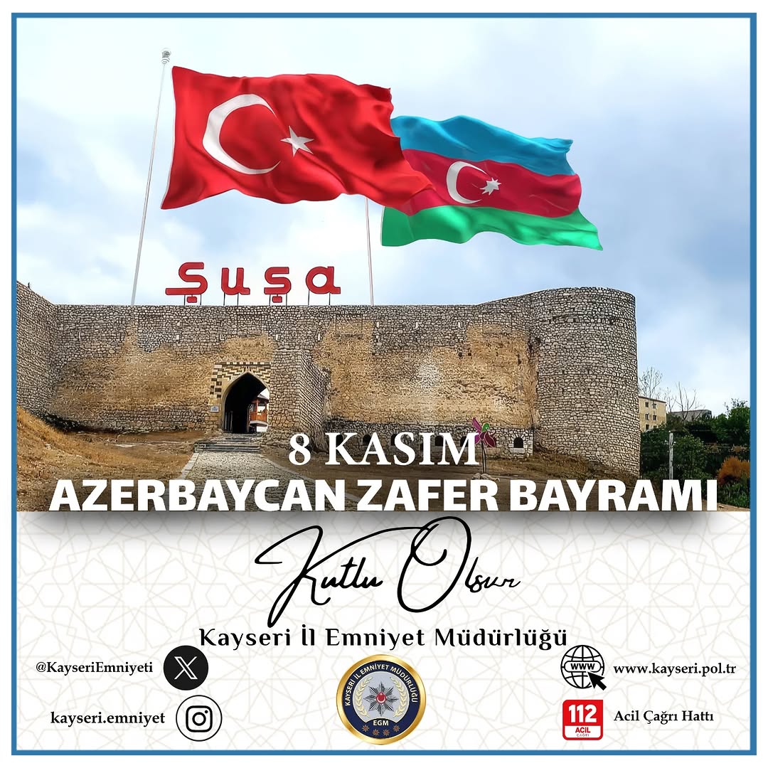 Kayseri Emniyet Müdürlüğü, 8 Kasım Azerbaycan Zafer Bayramı'nı kutlayan bir mesaj yayımladı. Mesajda, iki ülke arasındaki kardeşlik bağlarına vurgu yapıldı.