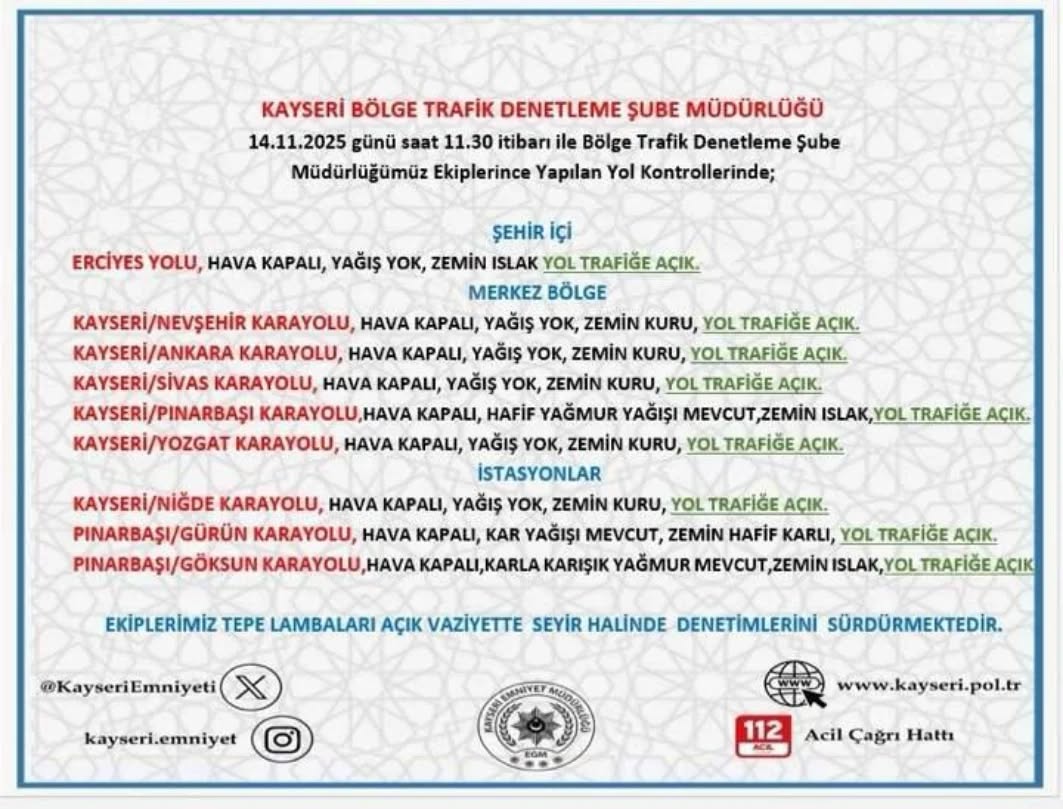 Kayseri Emniyet Müdürlüğü, sürücüleri ve vatandaşları her zaman dikkatli olmaya çağırıyor. Özellikle hava koşulları aniden değişebileceğinden, yolculuk öncesi güncel durumu takip etmek önem taşıyor.