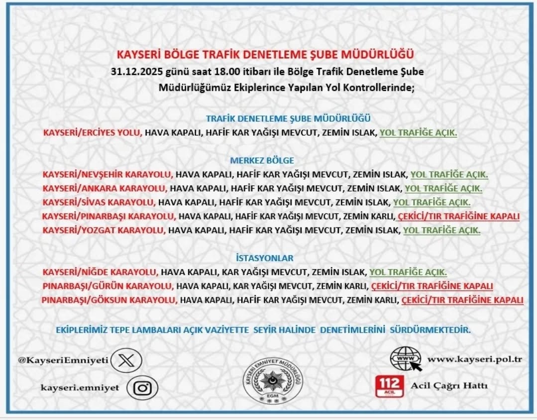 Kayseri Emniyet Müdürlüğü, yılbaşı nedeniyle hem trafik hem de genel güvenlik anlamında ek tedbirler aldı. Vatandaşlar, olası bir olumsuzluk veya acil durumda 112 Acil Çağrı Merkezi'ni arayabilir. Yol durumu ile ilgili anlık bilgiler için resmi kurum sosyal medya hesapları ve web siteleri takip edilebilir.