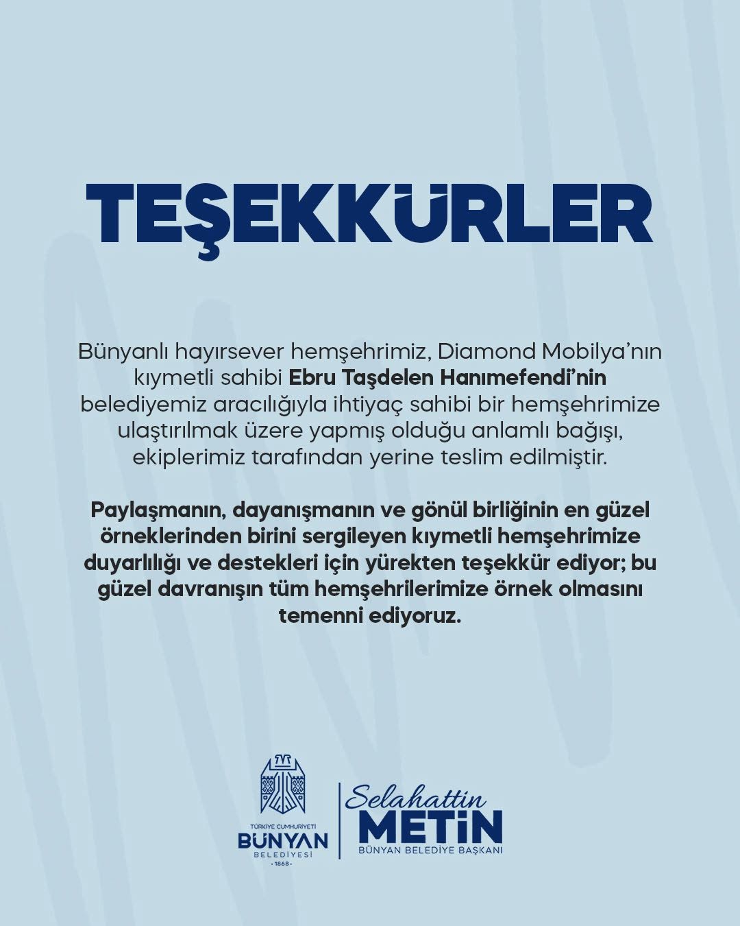 Bünyan'da hayırsever bir iş insanı, ihtiyaç sahibi bir aile için anlamlı bir bağışta bulundu. Diamond Mobilya'nın sahibi Ebru Taşdelen tarafından yapılan mobilya bağışı, Bünyan Belediyesi ekipleri aracılığıyla ihtiyaç sahibi hemşehriye ulaştırıldı.