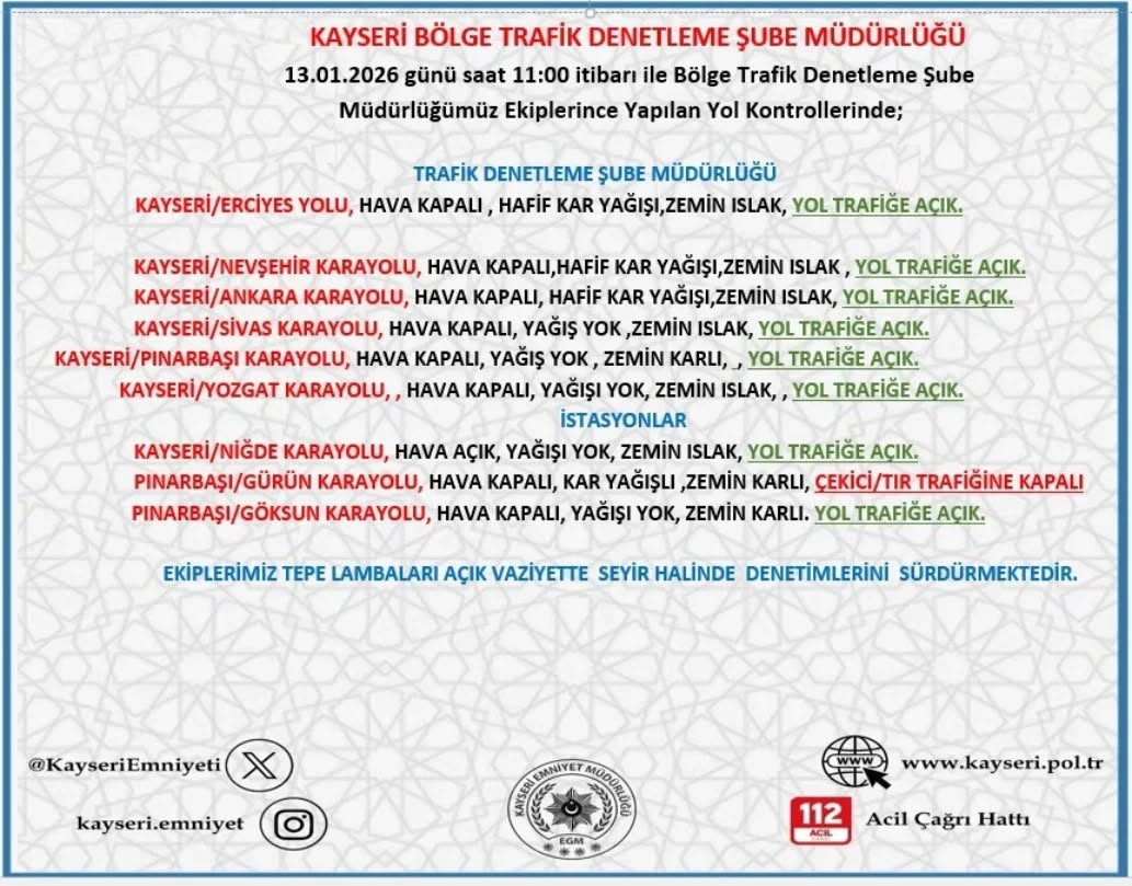 Kayseri Emniyet Müdürlüğü, 13 Ocak 2026 Salı günü saat 11:00 itibarıyla şehirdeki güncel hava ve yol durumu hakkında bilgilendirme yaptı.